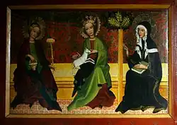Obraz został namalowany techniką tempery na desce lipowej, z elementami srebrnej folii, obramiony malowaną na czerwono ramą. W polu obrazu ukazano zasiadające na ławie trzy święte niewiasty – Martę, Agnieszkę i Klarę. Zostały one przedstawione jako młode kobiety o okrągłych twarzach pozbawionych niemal cech indywidualnych. Tożsamość określają wyłącznie atrybuty: Marta trzyma kropidło i koszyczek (lub pojemnik na wodę), Agnieszka z koroną na głowie dotyka Baranka, który wspina się na jej kolana, zaś Klara kładzie na kolana zamkniętą księgę. Dwie pierwsze z nich ubrane są w długie płaszcze i suknie; św. Marta ma ciemnoczerwony płaszcz i zieloną suknię, św. Agnieszka – zielony płaszcz z ciemnobłękitną podszewką i ciemnoczerwoną suknię. Święta Klara ubrana jest strój zakonny: czarny habit i welon z białą podwiką. Każda ze świętych ma głowę otoczoną ozdobnymi nimbami. Dynamiczne upozowanie świętych zostało zestawione ze sztywnym i statycznym układem ławy, drzewka i posadzki, której płyty i spoiny nie układają się zgodnie z zasadami perspektywy. Ciemne neutralne tło obrazu przysłania namalowana na srebrnej folii ciemnoczerwona kotara z bogatą dekoracją ornamentalną.