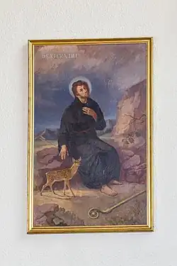 W ikonografii przedstawia się świętego w habicie zakonnym, często w jaskini lub na jej tle, z łanią i z ręką przebitą strzałą, czasem też z książką i laską pasterską w dłoni.