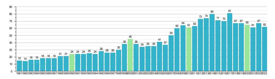 Dane dotyczą najwyższej liczby głosicieli osiągniętej w danym roku służbowym – od września do sierpnia następnego roku kalendarzowego[16]: