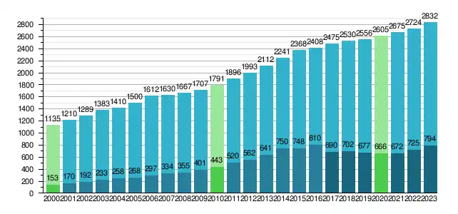 - najwyższa liczba głosicieli osiągnięta w danym roku służbowym[c] (liczby nad słupkami na wykresie)