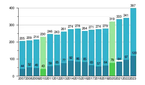- najwyższa liczba głosicieli osiągnięta w danym roku służbowym[c] (liczby nad słupkami na wykresie)