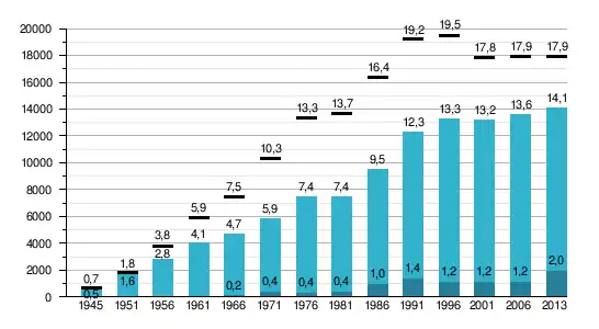 - najwyższa liczba głosicieli osiągnięta w danym roku służbowym[c] (liczby nad słupkami na wykresie)