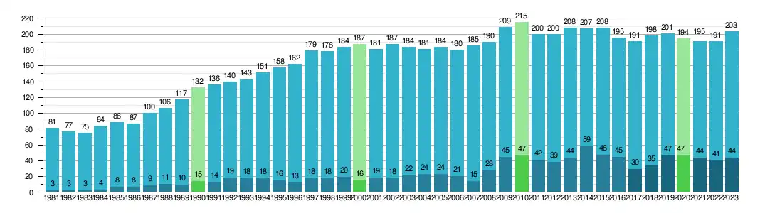 - najwyższa liczba głosicieli osiągnięta w danym roku służbowym[c] (liczby nad słupkami na wykresie)