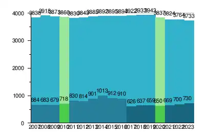 - najwyższa liczba głosicieli osiągnięta w danym roku służbowym[c] (liczby nad słupkami na wykresie)