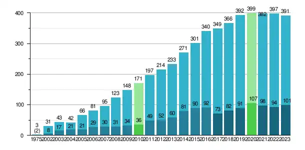 Dane z roku 1975 i od roku 2002 na podstawie oficjalnych raportów o działalności[21]: