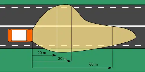 - ↑ taka budowa reflektorów skutkuje tym, że światła mijania dla pojazdów przeznaczonych do jazdy prawą stroną jezdni (jak w całej kontynentalnej Europie i na Islandii) są inne, niż tych dla ruchu lewostronnego (Wielka Brytania i Irlandia), zatem np. jazda nocą po drogach na Wyspach Brytyjskich nieprzystosowanym pod tym względem pojazdem z kontynentu (i odwrotnie – w Europie samochodem z Wysp) skutkować będzie oślepianiem kierowców pojazdów nadjeżdżających z przeciwka