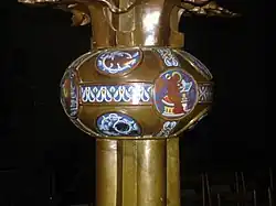 Siedmioramienny świecznik składa się z 74 elementów, waży ponad 400 kg, jest wysoki na 4 metrów, zaś całkowita rozpiętość ramion wynosi ponad 4,5 m. Czworoboczna podstawa posiada bogatą dekorację rzeźbiarską. Nóżki tworzą lwy, oraz stylizowane skrzydlate smoki o fantastycznie kształtowanych ogonach. Pomiędzy nóżkami ażurowe elementy z personifikacjami czterech cnót kardynalnych (Męstwo, Roztropność, Umiarkowanie i Sprawiedliwość), figurkami proroków (Izajasza, Jeremiasza, Ezechiela i Daniela) oraz alegoriami czterech rzek (Eufrat, Tygrys, Piszon i Gichon). Spośród nodusów ozdobionych w XIX w. kryształem górskim jeden zachował dawną emaliowaną dekorację, na którą składają się m.in. medaliony z wizerunkami Czterech Ewangelistów ukazanych w trakcie pisania ksiąg, stojących na pulpitach. Obok zostały ukazane symbole Ewangelistów – anioł, wół, orzeł i lew.