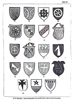 - ↑ Opis współczesny jest skonstruowany zgodnie z obecnymi zasadami heraldyki. Zobacz: Blazonowanie