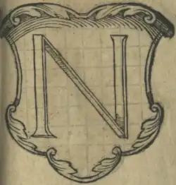 Cuius insignia elementum Alphabeti N. capitale et versatum, greco magis quam latino smile, in campo celestino.