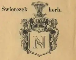 Swirczek. litera N in campo coelestino, est familie Polonice. W polu błękitnem majuskuła N srebrna.