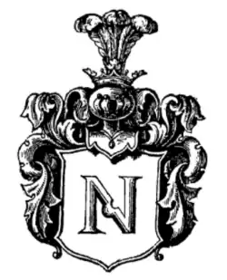 W polu błękitnym litera wielka N. u którey poprzeczna linia jednocząca dwie poboczne, w śrzodku, jak pół obrączki wydęta bydź powinna. Na Hełmie trzy pióra strusie.