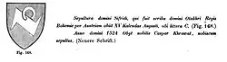 Przedstawienie z nekrologu z 1300 roku: Biały wolfsangel z kółkiem tudzież tzw. Świerczek w czerwonym polu[11].