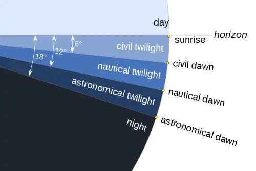 Według National Institute of Standard and Technology świt to część poranka, kiedy Słońce znajduje się 6° poniżej horyzontu[3].