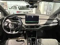 Kokpit Enyaq iV utrzymany został w futurystycznym wzornictwie rozwijającym projekt z przedstawionego rok wcześniej czwartego wcielenia modelu Octavia. Kokpit wykończono z połączenia materiału i aluminium, z niewielkim cyfrowym prędkościomierzem na wprost kierowcy i dużym, 13-calowym ekranem dotykowym do sterowania systemem multimedialnym, radiem, klimatyzacją i podstawowymi funkcjami pojazdu w centralnym miejscu kokpitu[10].