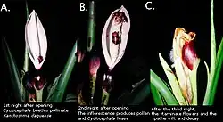 - Po przekwitnięciu rośliny otwarta komora pochwy zbiera wodę deszczową, która zmieszana z pyłkiem tworzy mikroekosystem wodny (fitotelmę), zasiedlany przez stawonogi. Głównymi lokatorami fitotelm są roztocze, skorki, pluskwiaki z rodziny tasznikowatych, larwy ochotkowatych, bzygowatych i ćmiankowatych oraz chrząszcze z rodziny pływakowatych, kusakowatych, ryjkowcowatych i z gatunku Macrostola costulata z rodziny łyszczynkowatych. Owady te żywią się sokami roślinnymi, pyłkiem i obumarłymi szczątkami rośliny, a także innymi mieszkańcami mikroekosystemu[6].
