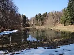 Kasinka Mała – Lubogoszcz, do połączenia ze szlakiem czerwonym. Czas przejścia do stawku ok. 35 min.[4]