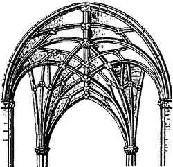 - prezbiterium katedry w Gloucester z lat 1337-ok.1357 (sklepienie sieciowe z trzema liniami żeber przewodnich)
