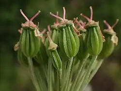 - Rozłupnie o długości 5–8 mm[6] (czasem do 10 mm[5]), krótsze od szypułek[6]. Krążek miodnikowy na szczycie owocu niski, z karbowanym brzegiem, zwieńczony dwiema szyjkami słupka od niego dłuższymi[5].