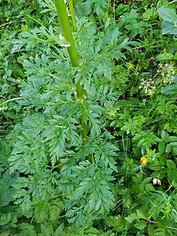 - Ciemnozielone i błyszczące, na brzegu szorstkie[5]. Dolne liście są długoogonkowe o blaszce w zarysie trójkątnie jajowatej, 2–3-krotnie pierzastej[5]. Odcinki ostatniego rzędu są jajowatolancetowate, zbiegające po osadce, ząbkowane, delikatnie orzęsione na brzegu[6]; na szczytach ząbków znajduje się chrząstkowate ostrze[5]. Górne liście u nasady z pochwami obłonionymi na brzegu, są mniejsze i słabiej podzielone od dolnych[5].