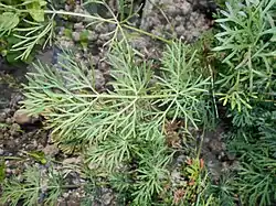 - Dolne liście osadzone na rynienkowatych, długich ogonkach, u nasady rozszerzających się pochwiasto. Blaszka tych liści jest w zarysie podługowato jajowata, 2–3-krotnie pierzasto podzielona, odcinki liści są równowąskie – mają do 15 mm długości i 1 mm szerokości. Mają ostre wierzchołki i owłosione brzegi. Liście średnie i górne siedzą na pochwiastych, nieco rozdętych nasadach i mają blaszki słabiej podzielone[5].