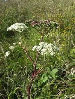 - Zebrane w baldaszki, które w liczbie 15–30 tworzą dość zbite baldachy złożone o owłosionych i kanciastych szypułach. Pokrywy składają się z co najwyżej dwóch listów, często ich brak. Pokrywki są liczne, mają kształt lancetowaty i błoniasty brzeg. Kielich z krótkimi, szydłowatymi działkami. Płatki korony są białe lub czerwonawe, szeroko jajowate, mają poniżej 1 mm długości. Na szczycie są wycięte i tu z zagiętą do środka łatką[5].