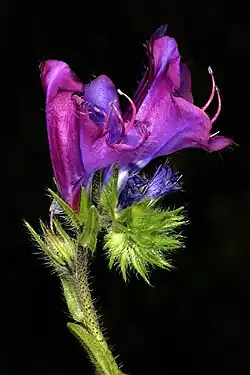 - Zebrane w kwiatostany typu skrętek wyrastające w kątach liści. Działki kielicha długości 7–10 mm w czasie kwitnienia (w czasie owocowania wydłużają się do 15 mm)[5], działki równowąskie[12]. Korona najpierw purpurowa, później niebieska lub fioletowa, o szerokolejkowatym kształcie i długości 18–30 mm. Z korony wystaje zwykle tylko para dłuższych pręcików[10].