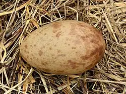 - Zniesienie przeważnie z 2 brunatnawych lub zielonawych jaj o średnich wymiarach 98 × 63 mm, silnie wydłużonych.