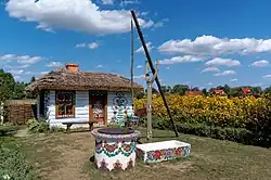Muzeum Wsi Markowa (Polska) – studnia „żuraw” i stodoła.