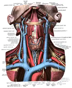 - może przesunąć się wyżej, stanowiąc żyłę tarczową środkową[4]