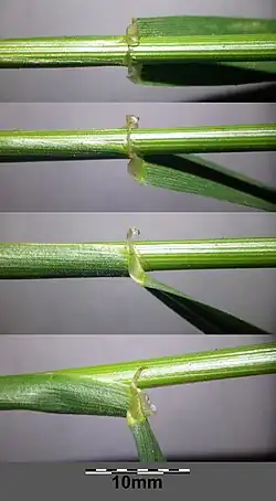 - Jasnozielone, bruzdkowane, na spodniej stronie błyszczące, o szorstkich pochwach. Młode liście są przeważnie zwinięte.