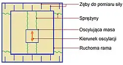 Cały proces mierzący obrót żyroskopu zachodzi w mechanizmie wykorzystującym efekt Coriolisa. Mechanizm ten składa się ze stale oscylującej masy wewnątrz ramki, która połączona jest z obudową zewnętrzną układem mikrosprężyn pod kątem 90° do kierunku ruchu masy (rys. 2). Drgania masy powodują na skutek występowania ruchu obrotowego powstanie siły działającej na ruchomą ramkę, w efekcie czego następuje przesunięcie ramki w kierunku prostopadłym do drgań masy. Przesunięcie to powoduje zmianę pojemności kondensatora grzebieniowego. Gdy ciało się nie obraca, ramka pozostaje nieruchoma, a pojemność kondensatora jest stała.