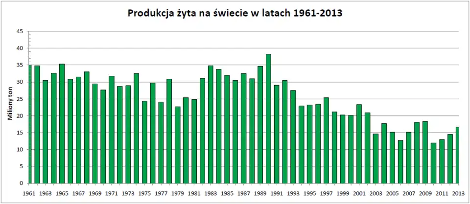 W latach 1961–2012 w Polsce wytwarzano średnio 6 milionów ton żyta rocznie. Najwyższy poziom 9 540 277 ton produkcja osiągnęła w roku 1984. Od tego czasu zbiory żyta systematycznie malały, by w roku 2011 osiągnąć minimum 2 600 676 ton[13].