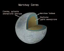 Wnętrze Ceres składa się z dużego skalnego jądra, ponad którym rozciąga się warstwa lodu wodnego i cienka skorupa zewnętrzna z lekkich minerałów. Podczas tworzenia się Układu Słonecznego Ceres przechodziła bogatą ewolucję, podczas której ciepło wydzielające się z jej wnętrza roztapiało lód i utworzyło wewnętrzny płaszcz z ciekłej wody, wypychając ją ku górze. Cięższe pierwiastki i minerały (np. krzem) wędrowały ku jądru. Jak się ocenia masa Ceres to od 17 do 27% masy całego pasa planetoid[13]. Woda – jej ilość pięciokrotnie przewyższa ilość słodkiej wody na Ziemi.
