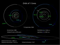 (1) Ceres porusza się wokół Słońca w środku głównego pasa planetoid, w średniej odległości 2,766 j.a. od Słońca. Najmniejsza odległość Ceres od Słońca (peryhelium) wynosi 2,55 j.a., największa zaś (aphelium) to 2,99 j.a. Okres orbitalny wynosi 4 lata i 219 dni. Orbita Ceres nachylona jest względem ekliptyki pod kątem 10,6°, mimośród zaś ma wartość 0,0794[1].