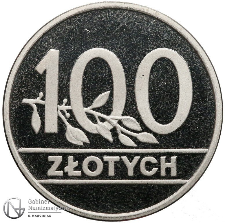Na tej stronie monety znajduje się napis „100 ZŁOTYCH”[1].