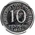 - ↑ Królestwo Polskie, 10 Fenigów 1917 - LUSTRZANKA - NGC PF65 CAMEO - RZADKOŚĆ [online], OneBid [dostęp 2024-10-10] (pol.).