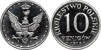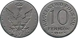 - ↑ Królestwo Polskie, LUSTRZANE 10 fenigów 1918 [online], OneBid [dostęp 2024-10-10] (pol.).