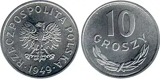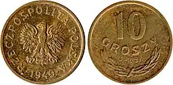 10 groszy 1949 – moneta dziesięciogroszowa wybita w miedzioniklu i alupolonie[1]. Odmiana w miedzioniklu wprowadzona do obiegu w dniu reformy walutowej z 30 października 1950 r., zarządzeniem z 14 lutego 1951 r. (M.P. z 1951 r. nr 14, poz. 196), odmiana alupolonie 26 września 1956 r. zarządzeniem Ministra Finansów z 12 września 1956 (M.P. z 1956 r. nr 80, poz. 963). Moneta została wycofana z obiegu z dniem denominacji 1 stycznia 1995 r. zarządzeniem prezesa Narodowego Banku Polskiego z 18 listopada 1994 r. (M.P. z 1994 r. nr 61, poz. 541)[1].