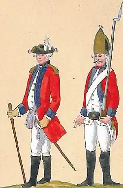 W początkowych latach istnienia regimentu wielu oficerów pełniło funkcje nie zawsze odpowiadające ich stopniom. Stanowisko szefa regimentu, związane z wielkimi poborami, było najczęściej uważane za synekurę. Szefowie posiadali prawo fortragowania (przedstawiania do awansu) oficerów[14]. Regimentem dowodził zazwyczaj pułkownik. Do 1789 roku w sztabie powinno służyć dziesięciu oficerów. Byli to: szef regimentu, pułkownik, podpułkownik, major, regimentskwatermistrz, adiutant, audytor i regimentsfelczer. Szefa i pułkownika w dowodzeniu kompaniami zastępowali kapitanowie sztabowi. W kompaniach do 1790 roku było dwóch kapitanów, sześciu poruczników i sześciu chorążych. Zatem w regimencie znajdowało się 24 oficerów wyłączając kapelana[8].