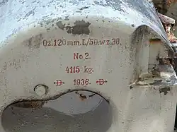 Pojawiające się w literaturze i czasopismach informacje, że działa miały oznaczenie wz.34/36 nie znalazły potwierdzenia w dokumentach archiwalnych, ani w informacjach wyrytych na zachowanych egzemplarzach dział[1][2]. W dokumentach broń występuje jako 12 cm SK L/50 M36/P w pisowni szwedzkiej, natomiast w polskich dokumentach, jako Działo 120 mm. L/50. wz.36. Taka sama informacja wyryta jest na płasku obsady zamka działa, czyli: Dz. 120 mm. L/50. wz.36 co jest widoczne na załączonym zdjęciu.