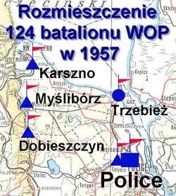 124 batalion WOP Police został rozformowany w 1963[3][a]. Strażnice rozformowanego batalionu podporządkowano 123 batalionowi w Szczecinie[5]. Strażnice III kategorii Karszno i Myślibórz Wielki oraz kategorii I Dobieszyn przekazano pod dowództwo batalionu WOP Szczecin. Strażnicę kategorii III Wydrzany o stanie 53 wojskowych rozformowano, a jej odcinek przekazano pod ochronę strażnicy kategorii I Świnoujście-lądowa. Strażnicę kategorii IV Police o stanie 27 wojskowych także rozformowano, a nadzór nad ruchem statków na trasie Szczecin-Świnujscie powierzono batalionowi portowemu Szczecin[b].