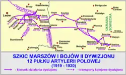 25 kwietnia 1920 pułk wyruszył na wyprawę kijowską. Baterie 5. i 9. walczyły pod Barem, 4. bateria pod Chodakami, Poszywką, Mytkami, Kijanówką, Malczowicami oraz Tarasówką, a 6. bateria pod Aleksiejowicami. 2 maja wznowiono działania ofensywne, a 12 pap walczył o Ujarzyńce, Hutę Kraśniańską, Rachny Lasowe, Wapniarkę, Tulczyn i Bracław. Po spektakularnym sukcesie i zajęciu Kijowa oddziały polskie przeszły do obrony. I dyon toczył walki w rejonie Krzyżopola, Popieluch, stacji kolejowej Rudnica, Cybulówki i Obodówki, ostatecznie stając w okolicach Trościańca i Czobotarki. II dyon walczył w rejonie Obodówki, Sawina, Goraczówki, Żabokrzycz i Cybulówki[11].