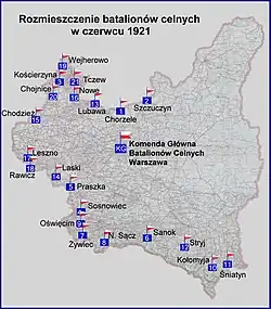 1 batalion celny w Chorzelach ⇔ 16 batalion celny w Nowem – VI 1921[14]