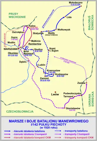 Gross batalionu (dwie kompanie z plutonem karabinów maszynowych) stanowił odwód dowódcy 15 Dywizji Piechoty w rejonie Miłosny. 17 sierpnia wziął udział w wypadzie na Mińsk Mazowiecki. Następnie w pościgu za bolszewikami dotarł do Broku. 27 sierpnia przetransportowany został do Krasnegostawu i wcielony do 2 Dywizji Piechoty Legionów. Wyróżnił się w walkach z 1 Armią Konną pod Miączynem i 2 września pod Gliniskami. 22 września batalion połączył się z kompanią karabinów maszynowych i skierowany został na front północny, gdzie wziął udział w bitwie nad Niemnem. Szlak bojowy zakończył w Mołodecznie.