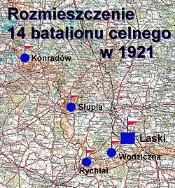 17 maja 1921 Główna Komenda Batalionów Celnych zarządziła zmiany dyslokacyjne batalionów. 14 batalion celny miał ochraniać odcinek granicy od Bogdaja do Bolesławca i rzeki Prosny. Sztab batalionu rozlokowany miał być w Kępnie [11].