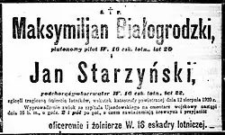 - 12 sierpnia 1920 podczas intensywnych działaniach bojowych zginęli w katastrofie plut. obs. Jan Starzyński i kpr. pil. Białogrodzki[29].