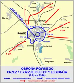 8 lipca na Równe od północnego wschodu uderzyła I Brygada Piechoty Legionów płk. Stefana Dąba-Biernackiego. Baterie artylerii 1 pap ogniem na wprost niszczyły gniazda karabinów maszynowych. Piechurzy wspólnie z artylerzystami odpierali też zaciekłe kontrataki „Budionowców”. Kontynuując natarcie nocą, brygada zdobyła miasto. W ciągu dnia odpierano bolszewickie kontrataki oddziałów 4. i 6 Dywizji Kawalerii. O zmroku 9 lipca dowódca armii gen. Raszewski, nie widząc szans rozbicia armii konnej, przerwał bitwę, a I Brygada wycofała się z miasta[21].
