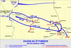 25 kwietnia ruszyło natarcie dywizji. Dość szybko złamano opór oddziałów sowieckiej 17 Dywizji Kawalerii, a przetransportowany samochodami do Wilska 1 pułk piechoty Legionów wyparł z miejscowości bolszewicki 522 pułk strzelców. Nocą z 25 na 26 kwietnia pododdziały dokonały obejścia Żytomierza i rano uderzyły na miasto od północnego zachodu i wschodu. Zagrożeni okrążeniem Sowieci rozpoczęli bezładny odwrót, a 58 Dywizja Strzelców została rozbita. Grupa gen. Dąba-Biernackiego straciła 3 poległych i 48 rannych[17]. 4 maja Grupa Operacyjna gen. Śmigłego-Rydza została przekształcona w 3 Armię[18]. 7 maja oddziały polskie wkroczyły do Kijowa[17].