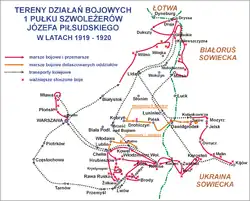 Działalność bojową pułk rozpoczyna w czasie wojny z Ukraińcami (styczeń-marzec 1919), a następnie kontynuuje podczas wyprawy wileńskiej (kwiecień-wrzesień 1919). 1 pułk szwoleżerów w maju 1920 został wysłany na front polsko-rosyjski i następnie wziął udział w walkach z Armią Czerwoną – głównie z konnicą gen. Siemiona Budionnego.