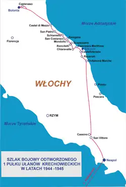 Zmniejszyło to nasilenie nieprzyjacielskiego ostrzału. Dalsze natarcie nie było jednak możliwe. Wieczorem czołgi wycofały się do rejonów wyczekiwania. Z uwagi na osiągnięte powodzenie i przełamanie Linii Gotów przez sąsiedni I Korpus Kanadyjski. W nocy Niemcy opuścili swoje stanowiska, pozostawiając w okopach jedynie patrole i słabą sieć posterunków. O świcie 2 września krechowiacy wspólnie z karpatczykami wznowili natarcie. Tym razem odniesiono sukces. 2 września utworzono w 1 BSK grupę pościgową: z czołowym 3 bsk i 3 szwadronem ułanów, którą dyslokowano na odcinek kanadyjski, skąd prowadziły pościg za odchodzącym wrogiem. W szpicy szły czołgi i kompania piechoty na transporterach opancerzonych. Prowadzący pościg 3 szwadron wraz z 3 bsk opanowały w walce grzbiet górski Boncio, wzg. Monte Merro, czołowa kompania strzelców karpackich i część 3 szwadronu opanowała wzg. 177 i przecięła szosę nadmorską nr 16 osiągając wybrzeże Adriatyku[13]. 3 szwadron zdobył sześć dział ppanc. 3 Panthery, kilkanaście km i sprzęt łączności. Ponadto wziął do niewoli 107 jeńców. W ciągu nocy wzięto jeszcze około 200 jeńców. Straty nieprzyjaciela na kierunku działania szwadronu: 35 zabitych. Straty szwadronu: dwóch rannych i jeden uszkodzony Sherman[14]. Ogółem podczas walk od początku sierpnia do 3 września poległo 10 żołnierzy, zniszczonych zostało 5 czołgów Sherman. Następnego dnia pułk został wycofany z frontu na dłuższy wypoczynek, uzupełnienie załóg i sprzętu oraz żołnierze udali się na urlopy[15].